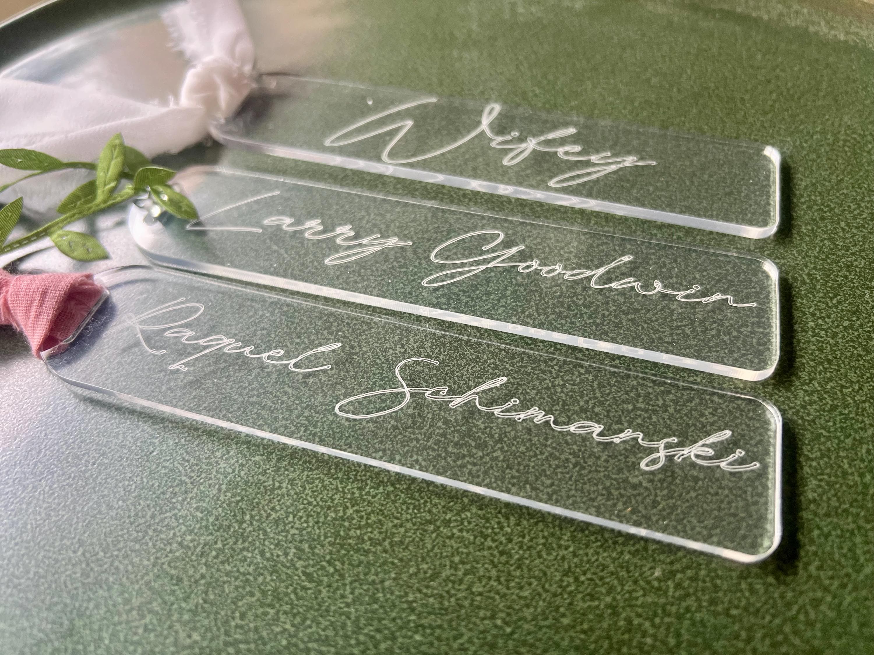 Key features include: - Materials: Clear acrylic with engraved personalization - Dimensions: Approximate size of 5.5" (L) x 1.2" (W) x 0.12" (D), perfect for holding in hand or slipping into a book - Ribbon options: Multiple colors available to suit your theme or taste - Personalization: Custom engraved name or message of your choice - Care instructions: Wipe clean with a soft cloth to maintain clarity and engraving quality