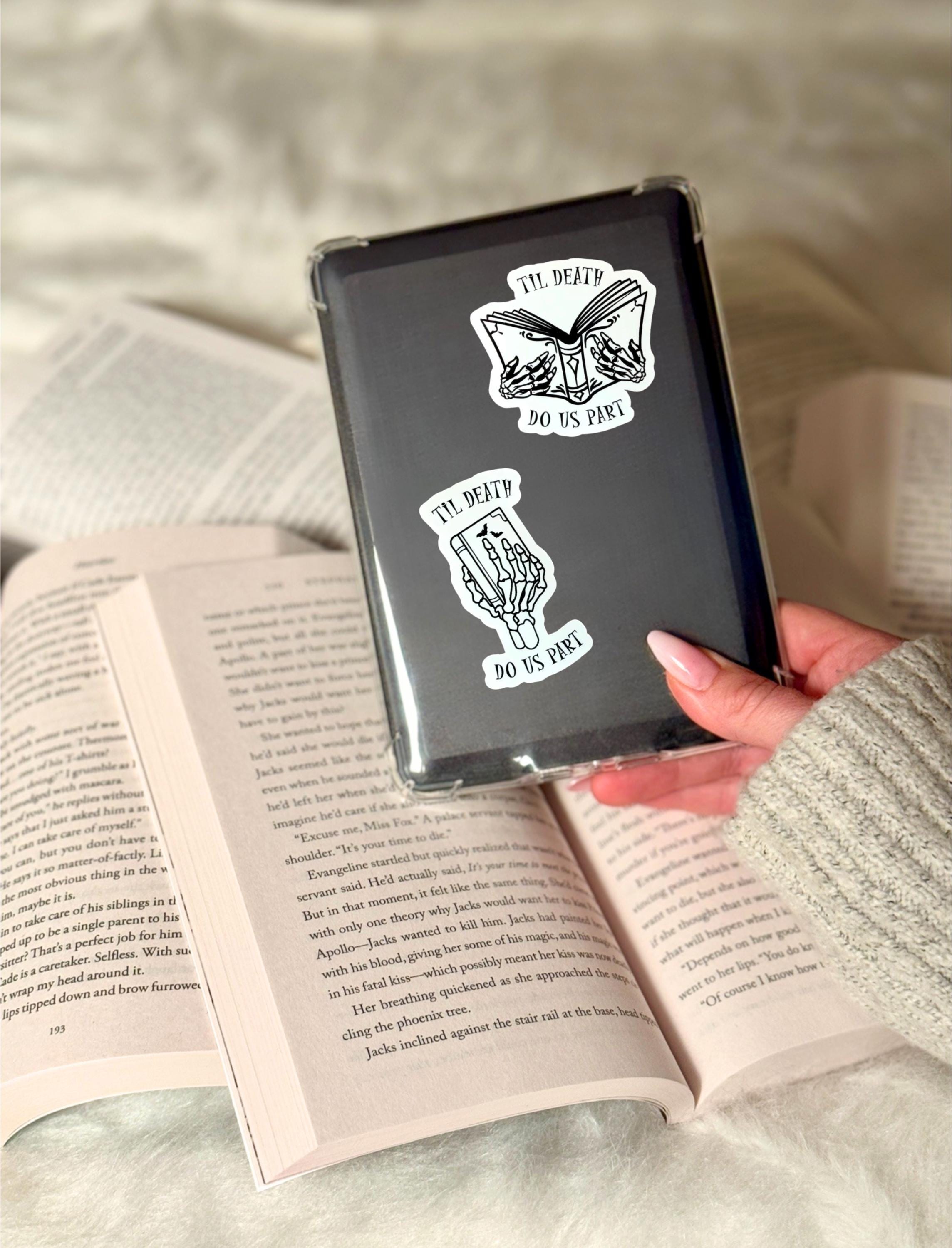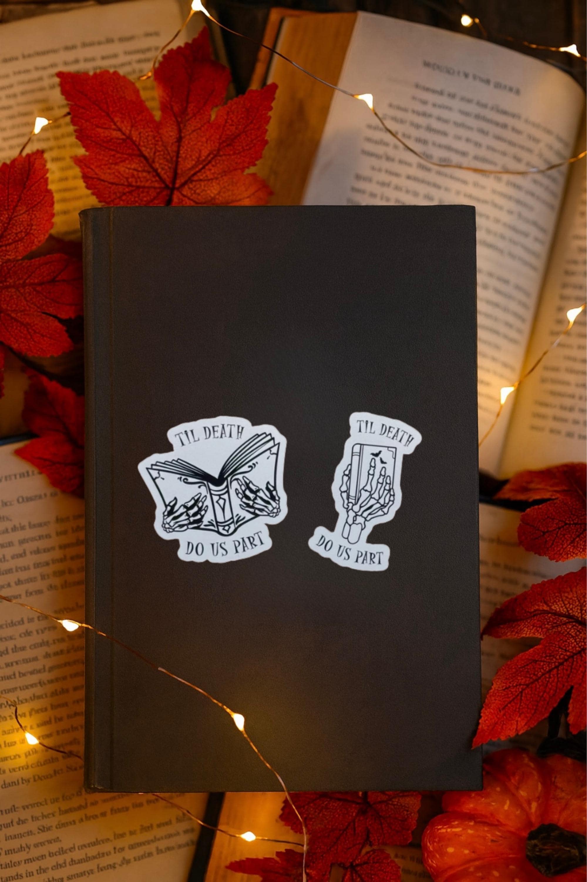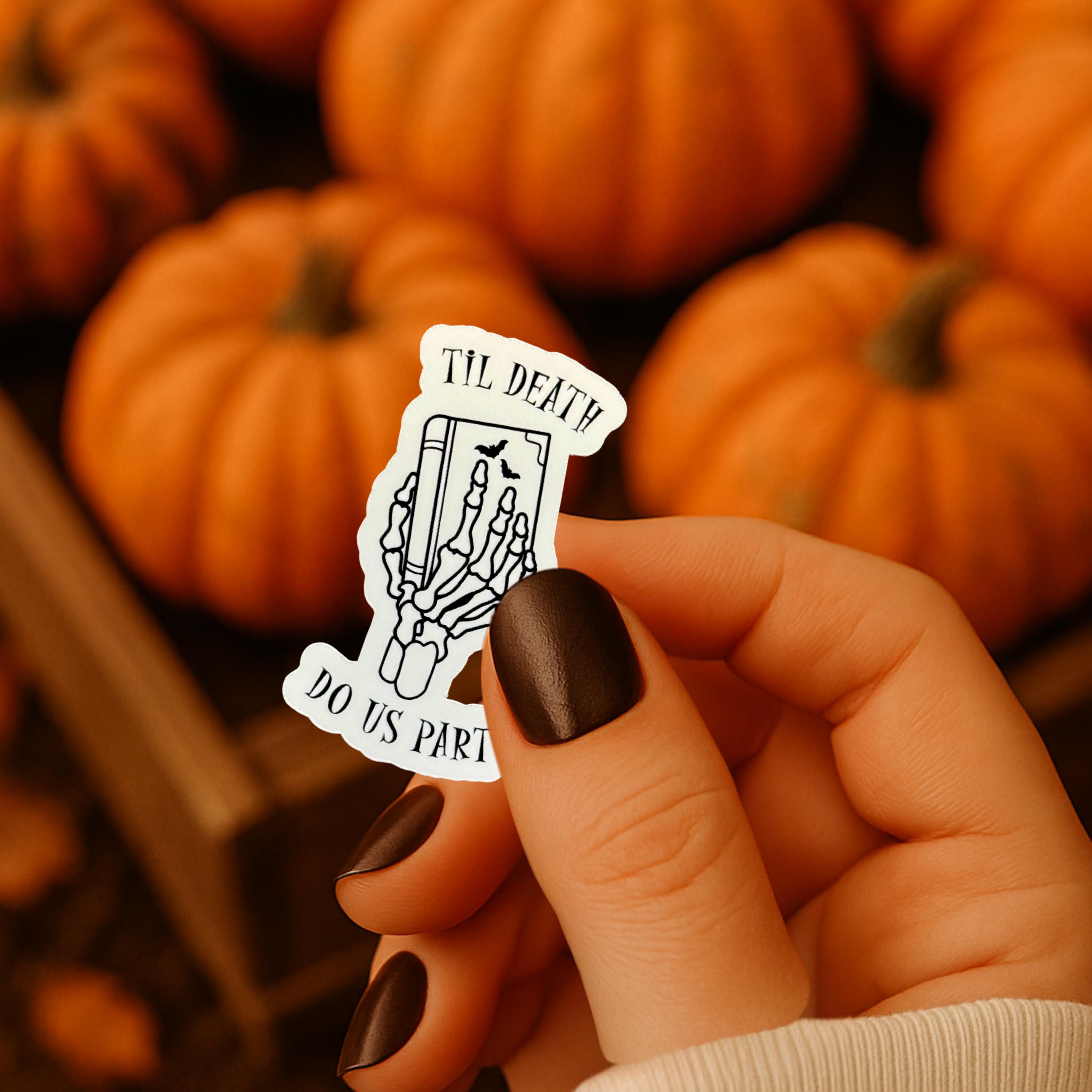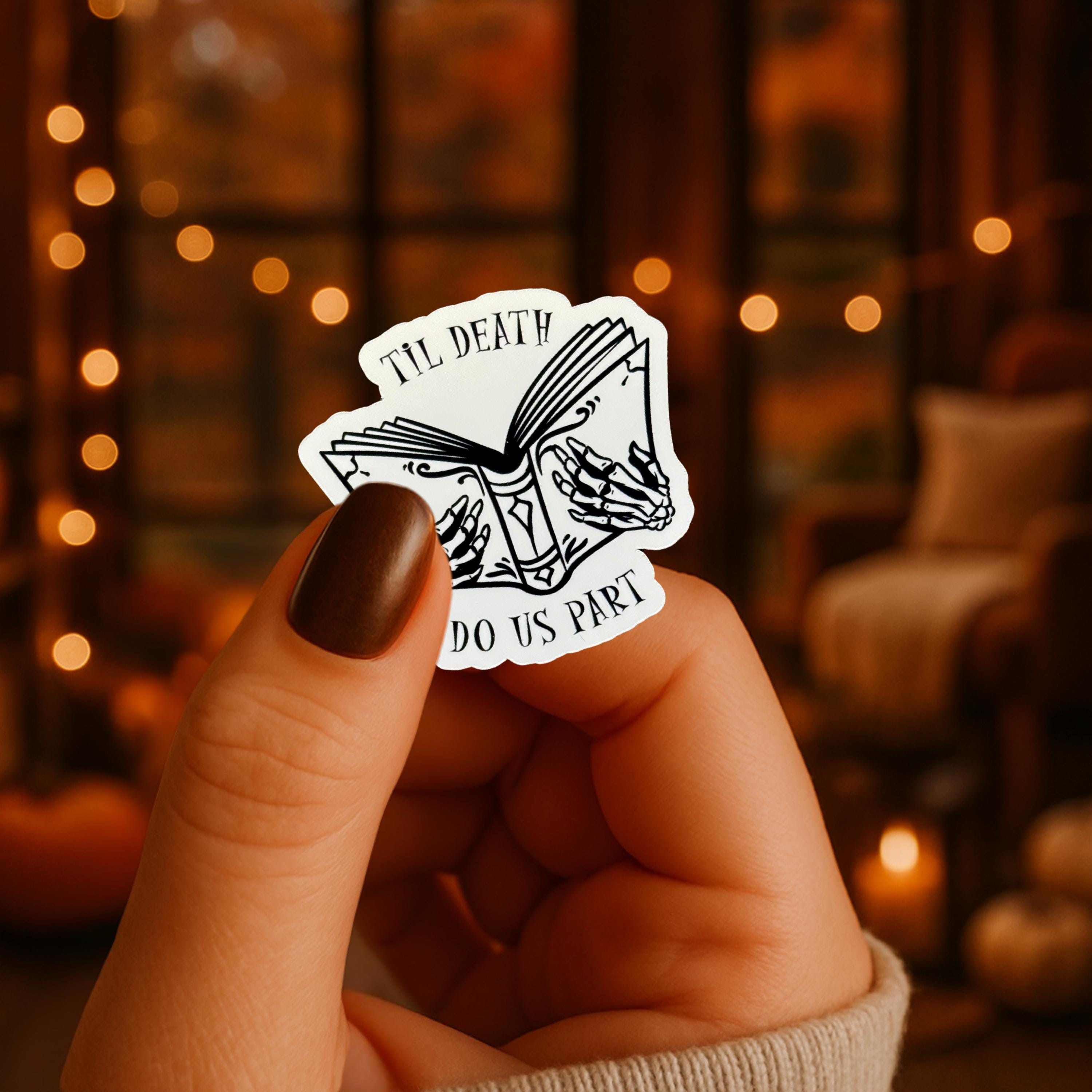 Add a spooky and bookish touch to your favorite items with this Til Death Do Us Part Skeleton Sticker. Perfect for book lovers, Halloween enthusiasts, and anyone obsessed with reading until their last breath! This glossy vinyl decal features a humorous skeleton holding a book and a hand, with the iconic phrase "Til Death Do Us Part." Whether you want to personalize your water bottle, laptop, Kindle, or journal, this sticker is the ideal accessory for the spooky season or year-round.