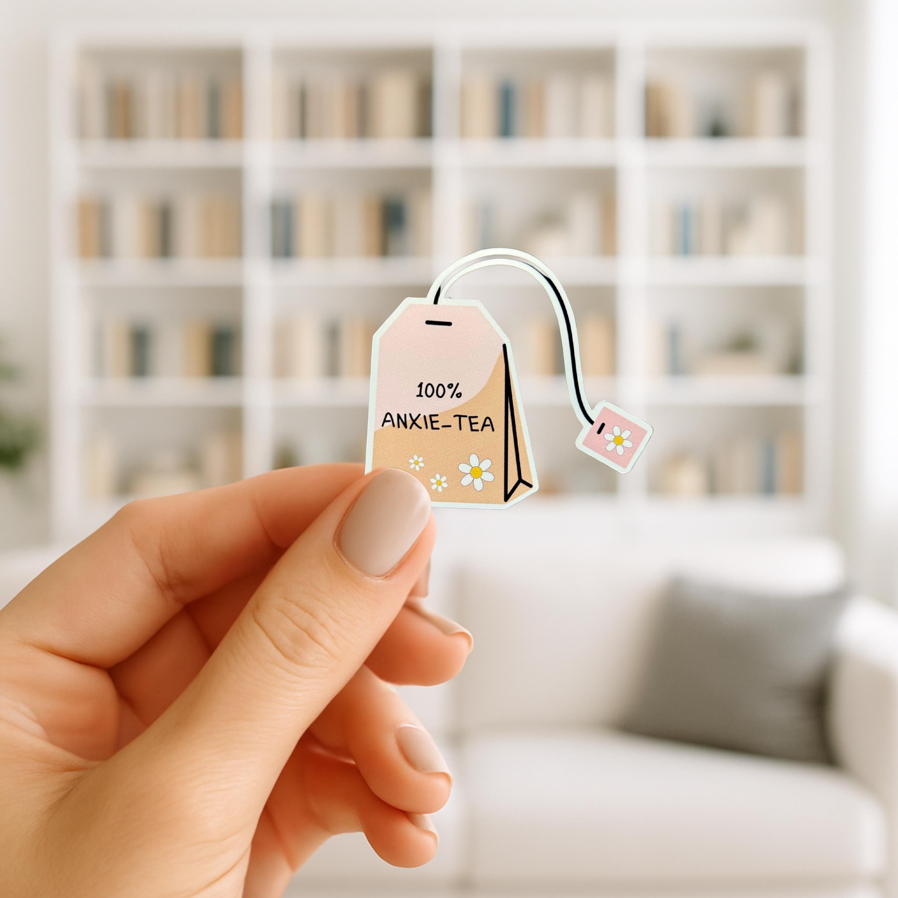 Add a touch of humor and mental health awareness to your belongings with this punny anxiety tea bag sticker. Perfect for anyone navigating anxiety or mental health challenges, this glossy vinyl decal combines a fun tea bag design with a playful phrase that says "100% ANXIE-TEA." It's an ideal gift for book lovers, tea enthusiasts, or anyone who could use a lighthearted reminder to take a breather.