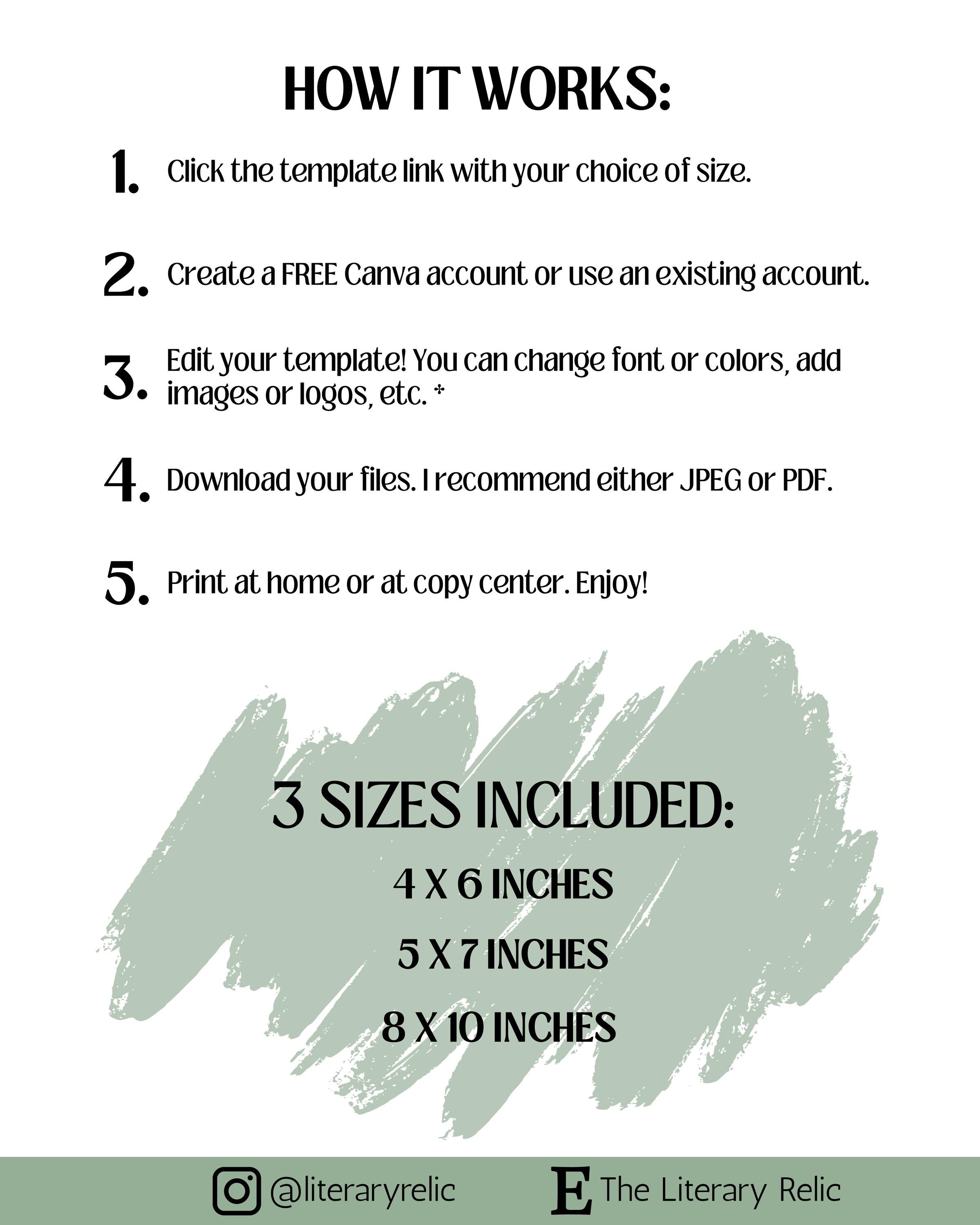 Key features include: - Fully editable Canva template for easy customization - Compatible with any device with internet access—no downloads required - Endless possibilities with duplicate chapters for a cohesive look - Elegant, minimalistic design that complements any book or literary wedding theme - Instant digital download, ready to personalize and print at home or through your preferred print shop - Various sizes - 4x6 inches - 5x7 inches - 8x10 inches