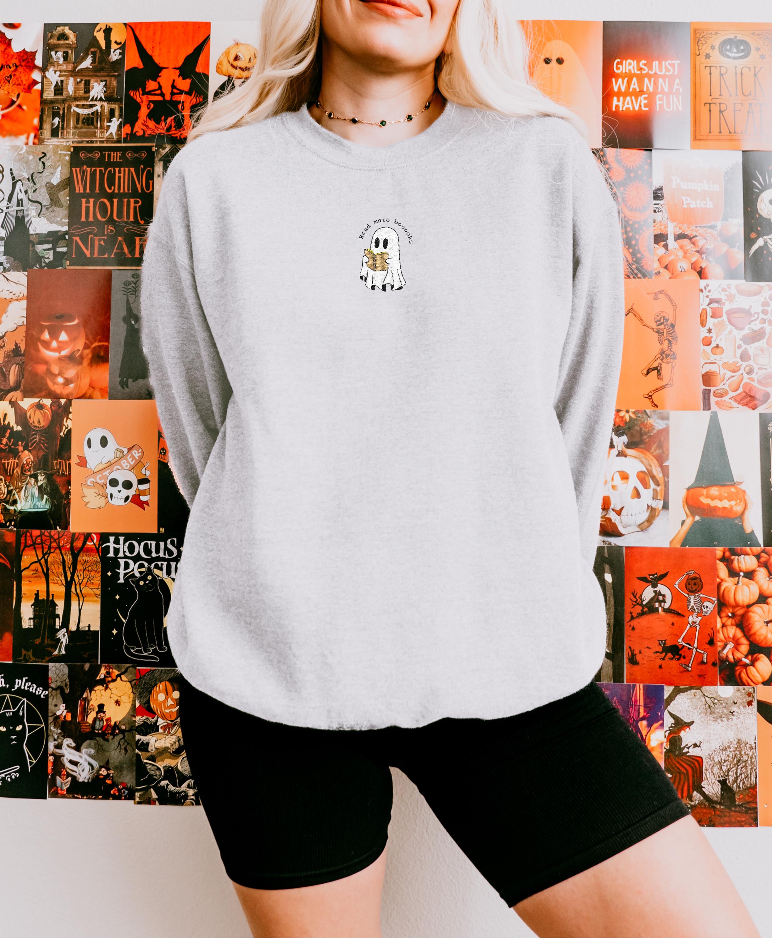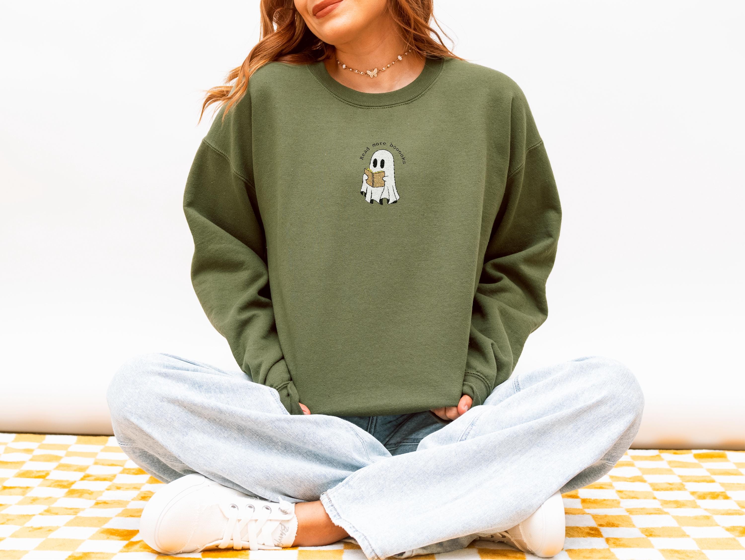 Key features include: - Unisex crewneck sweatshirt with a cozy, comfortable fit - Embroidered ghost holding a book graphic, perfect for book lovers and Halloween fans - Made from soft, durable heavy blend fabric for all-day comfort - Ideal for casual wear, seasonal festivities, or as a holiday gift for her and him - Easy to care for with machine wash and tumble dry