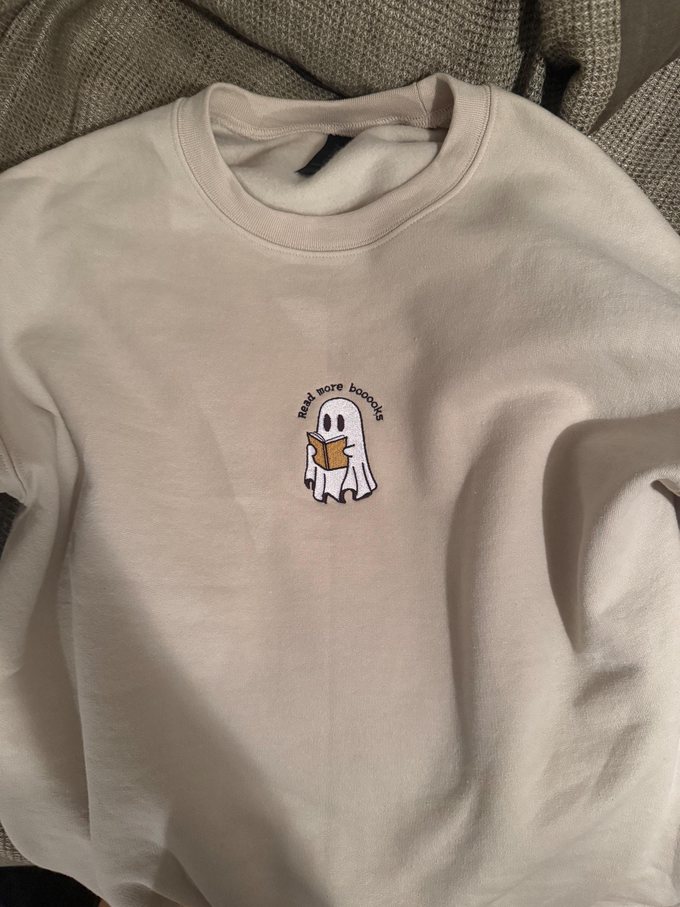 - Embroidered ghost holding a book graphic, perfect for book lovers and Halloween fans