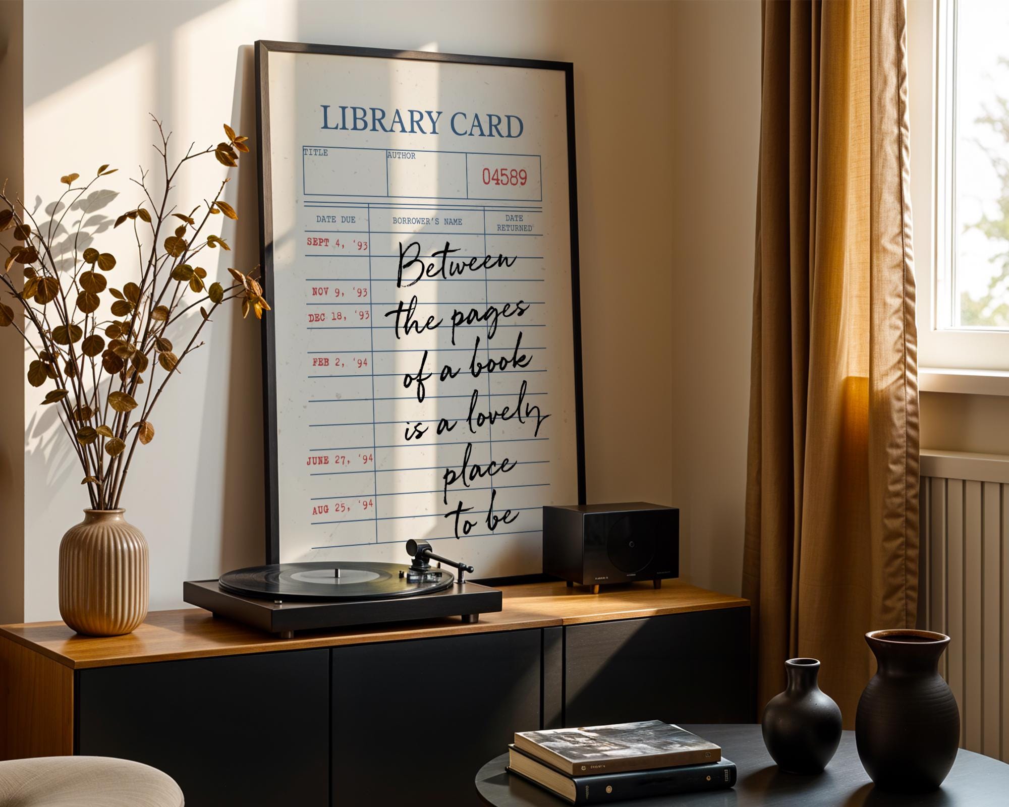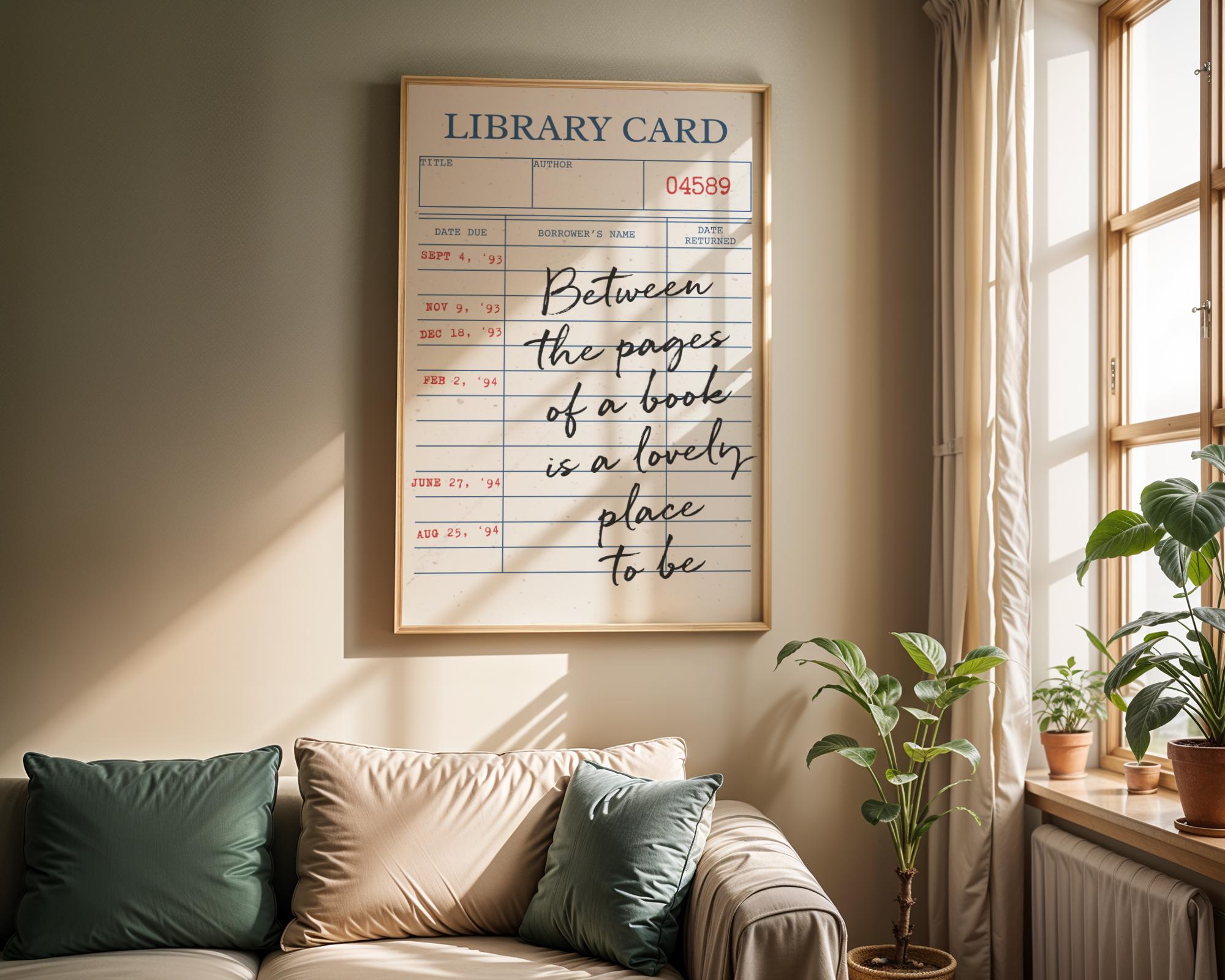 Discover the perfect addition to your reading nook or literary-inspired space with this charming Library Card Art Print. Designed to evoke nostalgia and celebrate your love for books, this vintage book lover wall decor features a beautifully crafted library card design complemented by an inspiring quote: "Between the pages of a book is a lovely place to be." Whether you're decorating a cozy corner in your home, study, or living room, this art print creates a warm and inviting atmosphere that sparks your passion for reading.