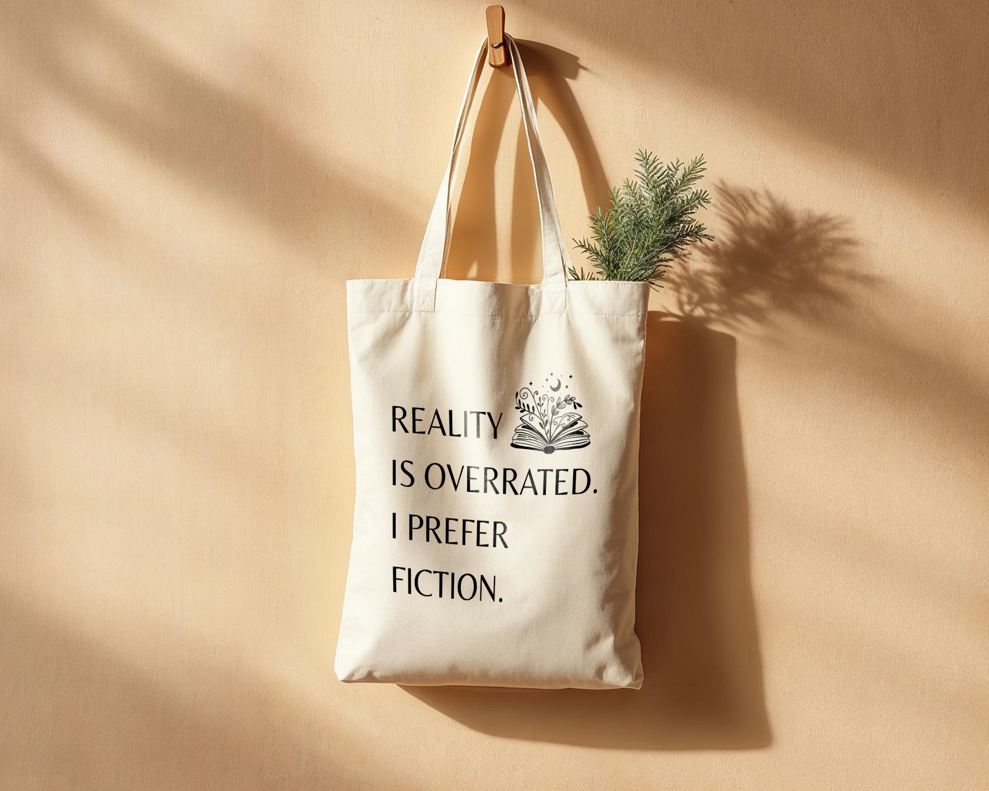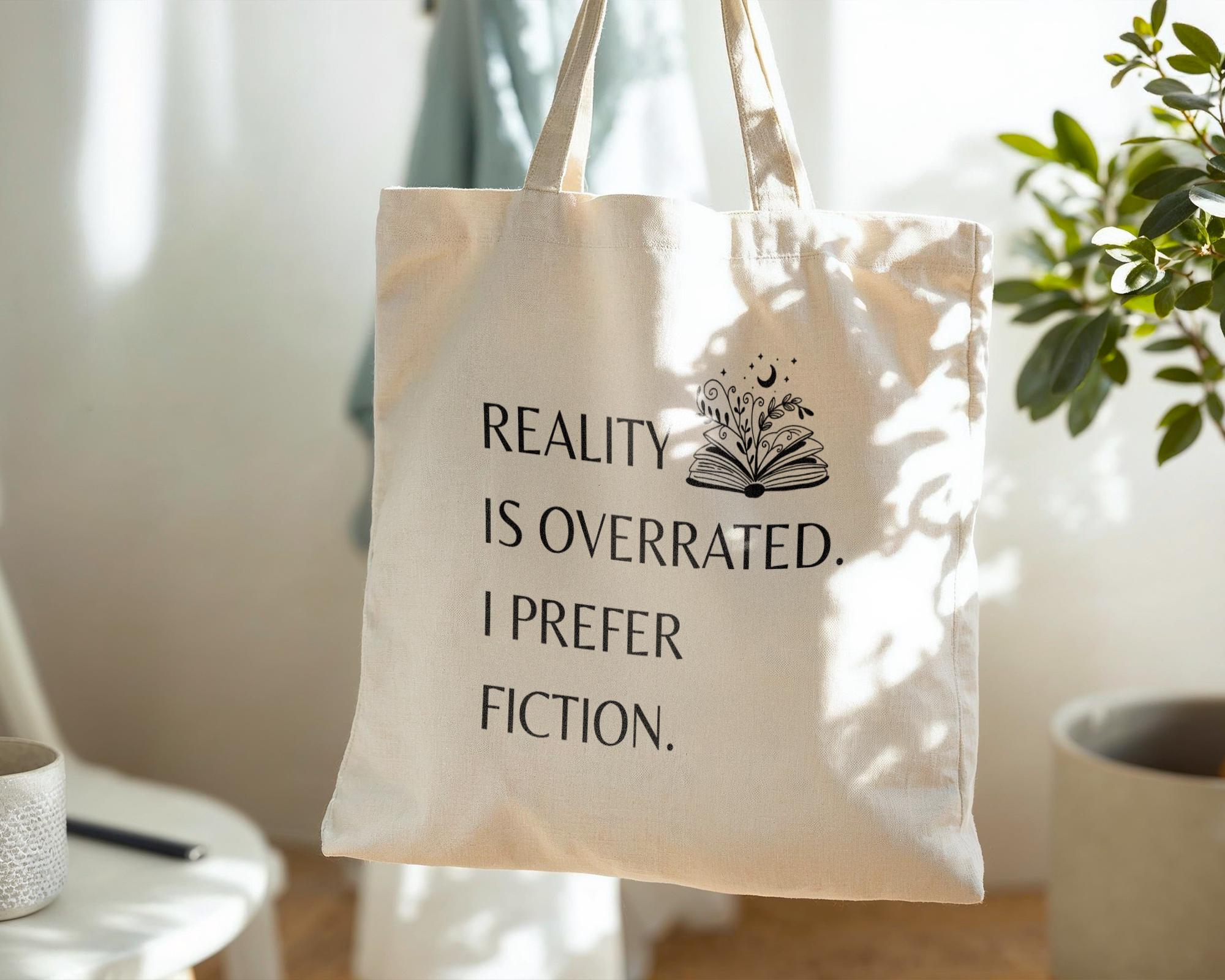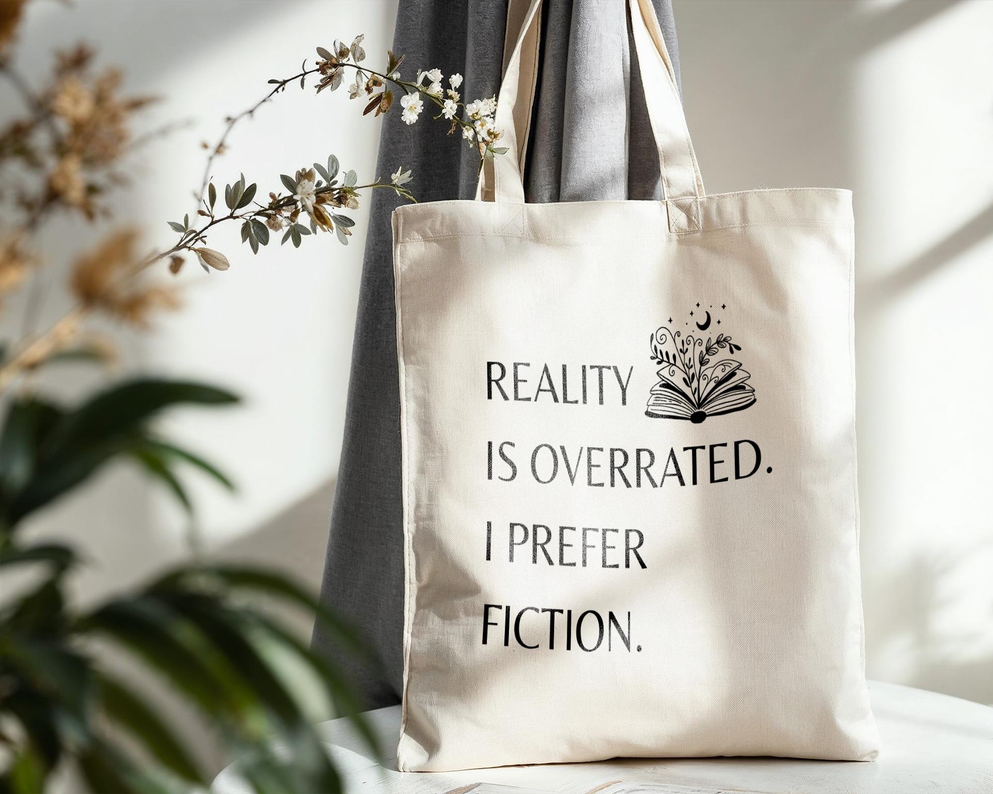 The sleek, flat corners give the tote a seamless, minimalist look, making it a stylish yet practical choice for carrying all your essentials. Its generous size comfortably fits books, notebooks, and more, making it a versatile reading accessory. The witty design features the phrase "Reality is overrated. I prefer fiction," adding a fun, humorous touch for those who believe in the magic of stories.