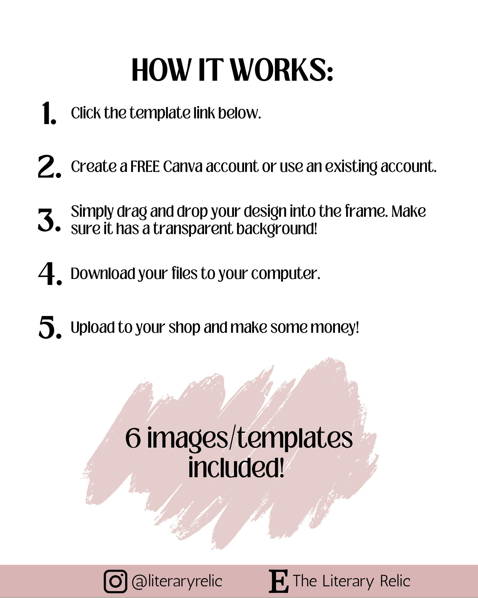 How to use: - Make your purchase - Download the PDF to your computer - Open the link to Canva (create a FREE account or log in) - Create your design with a transparent background - Upload your design to Canva - Drag and drop your artwork into the frame for a professional presentation
