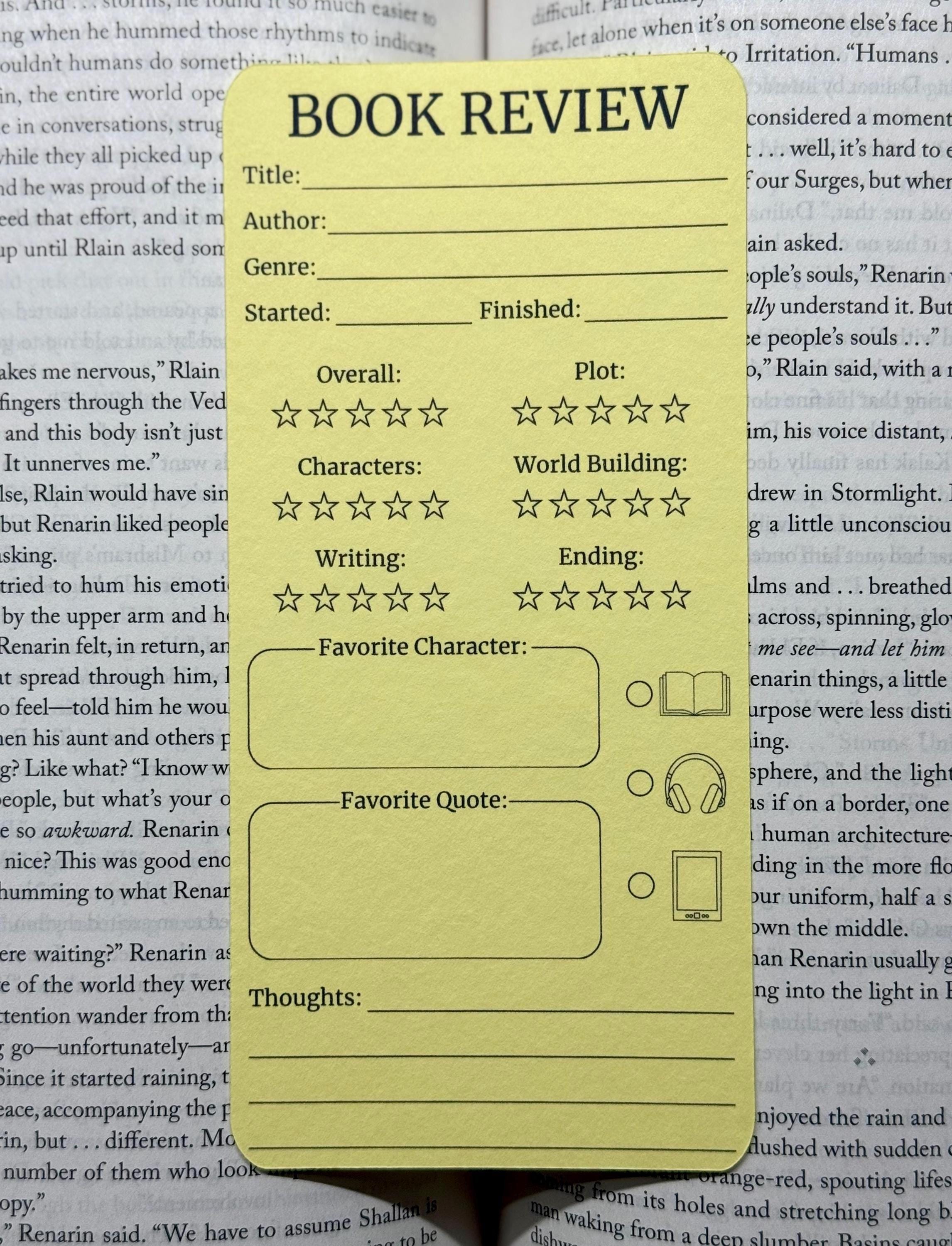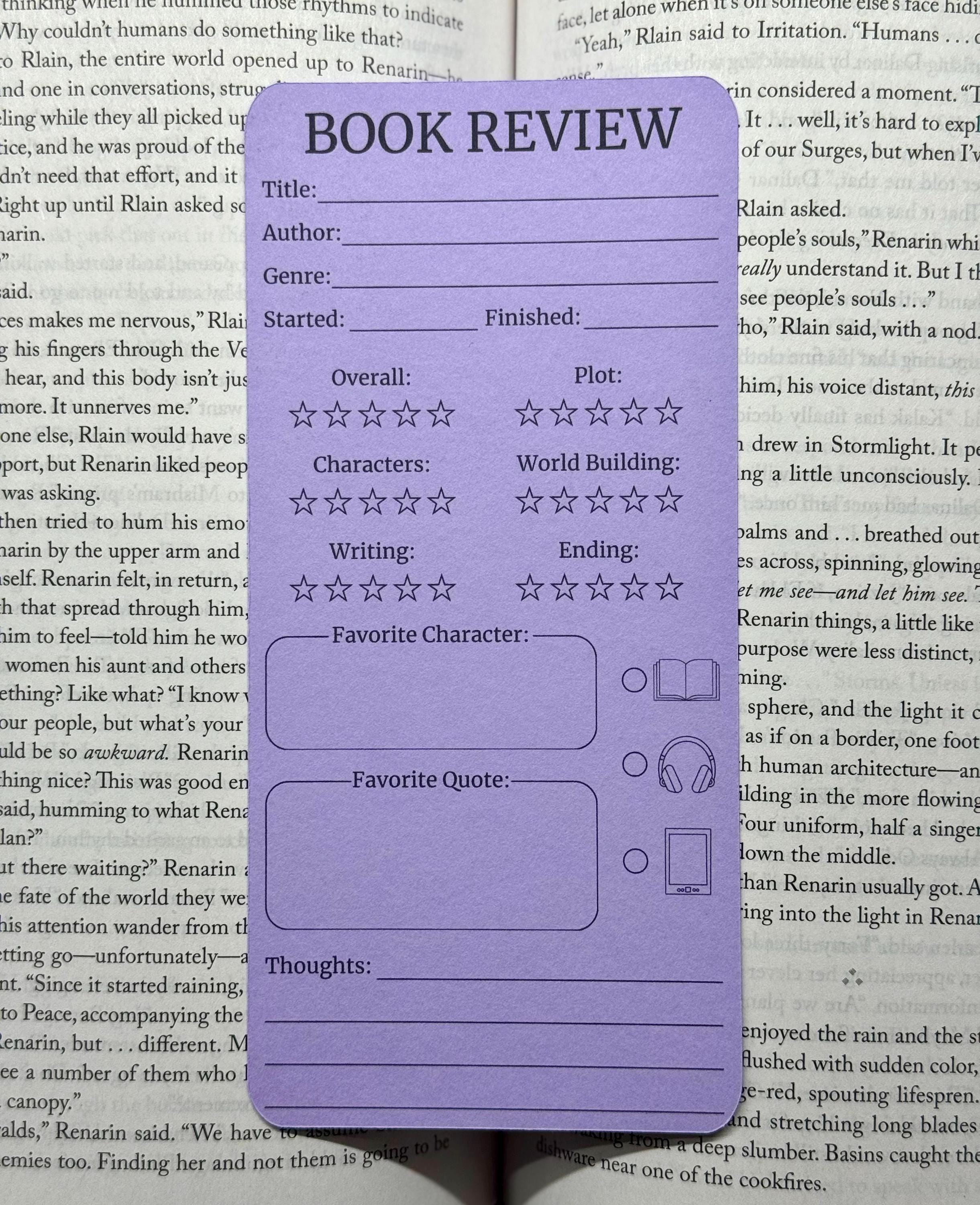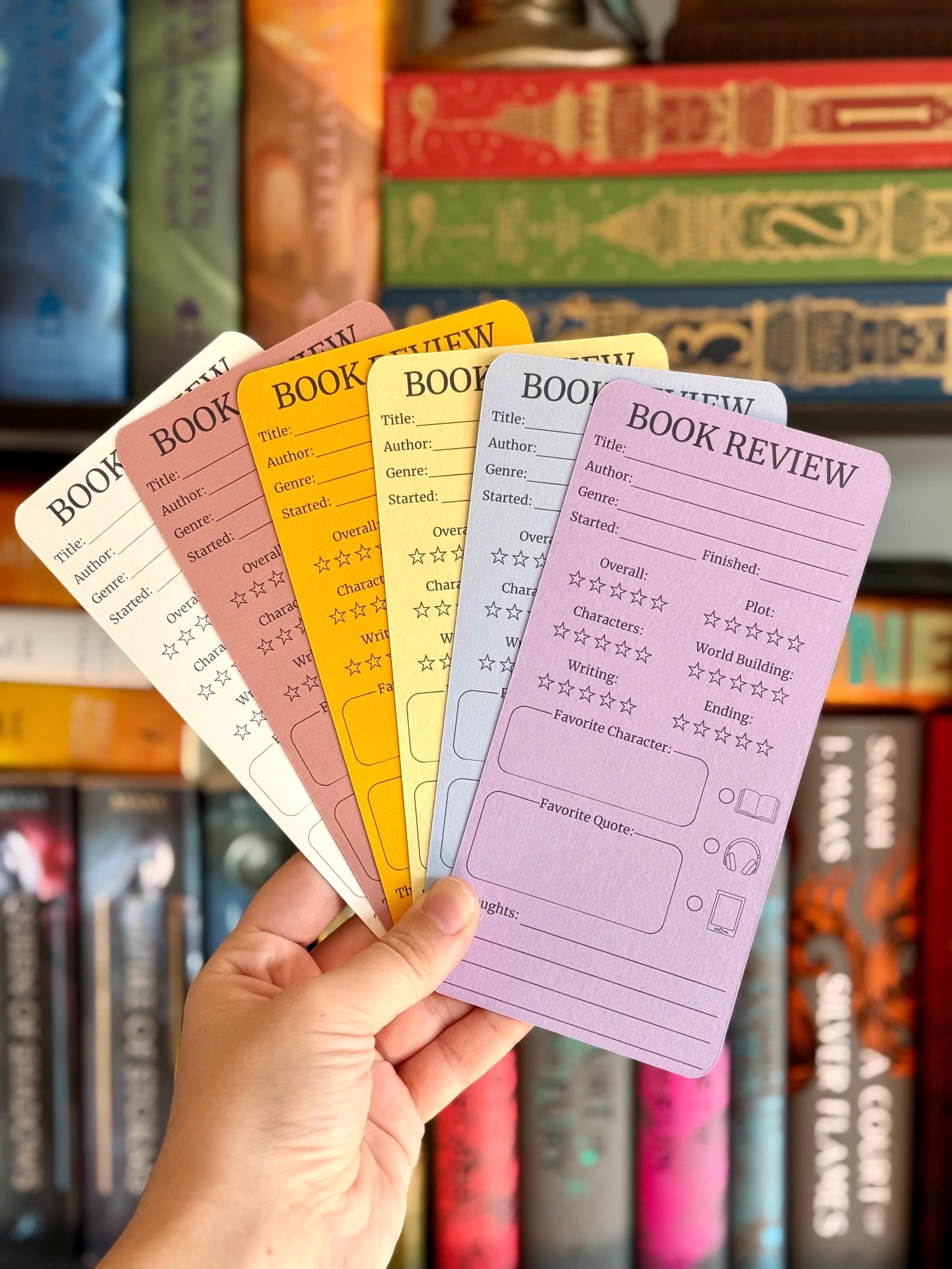 Each bookmark measures 3.25x7 inches, providing ample space to record your review of your favorite books. Write the book title, author, genre, start and end dates, favorite character, favorite quote, miscellaneous thoughts and give each a rating with the star system to reflect your thoughts.