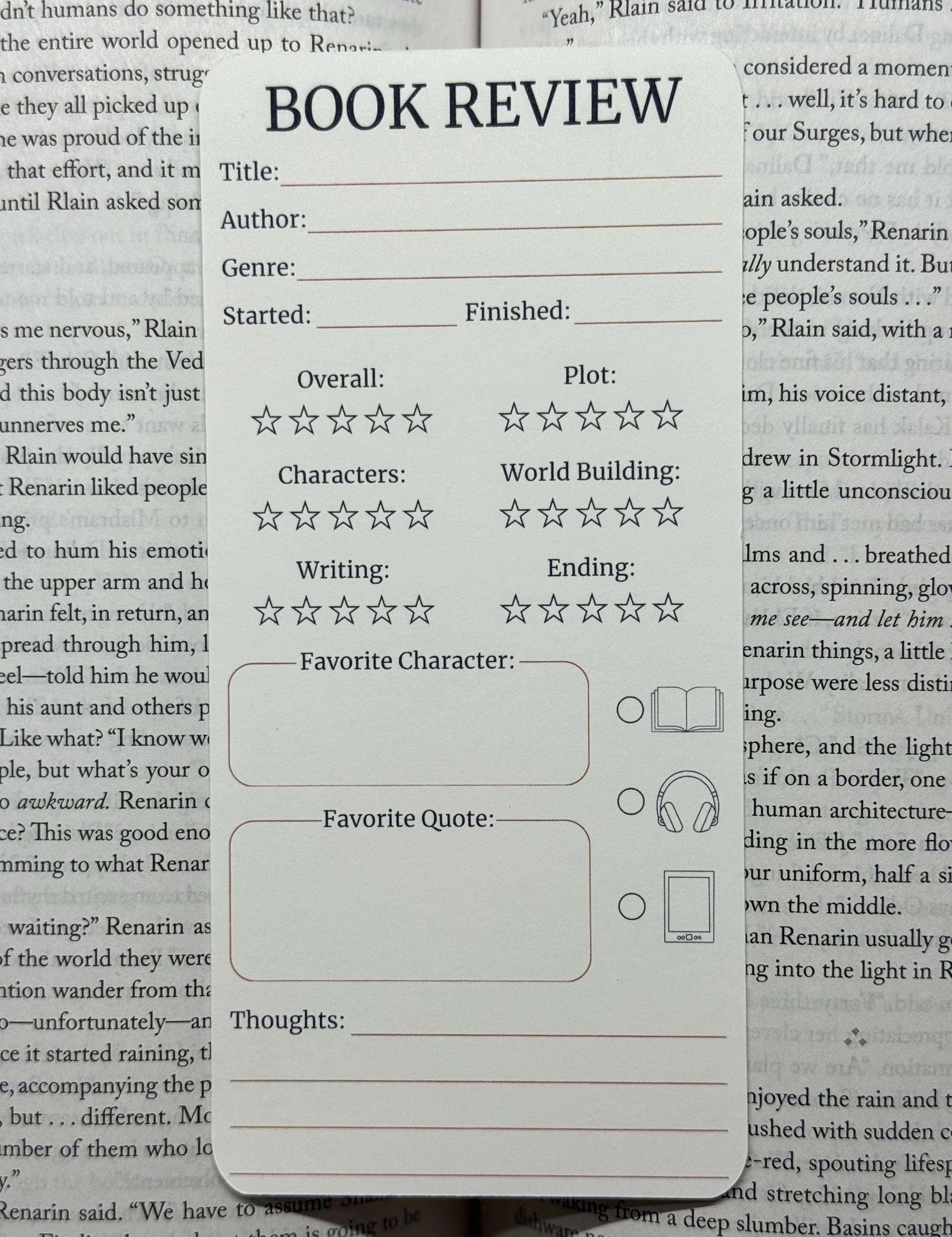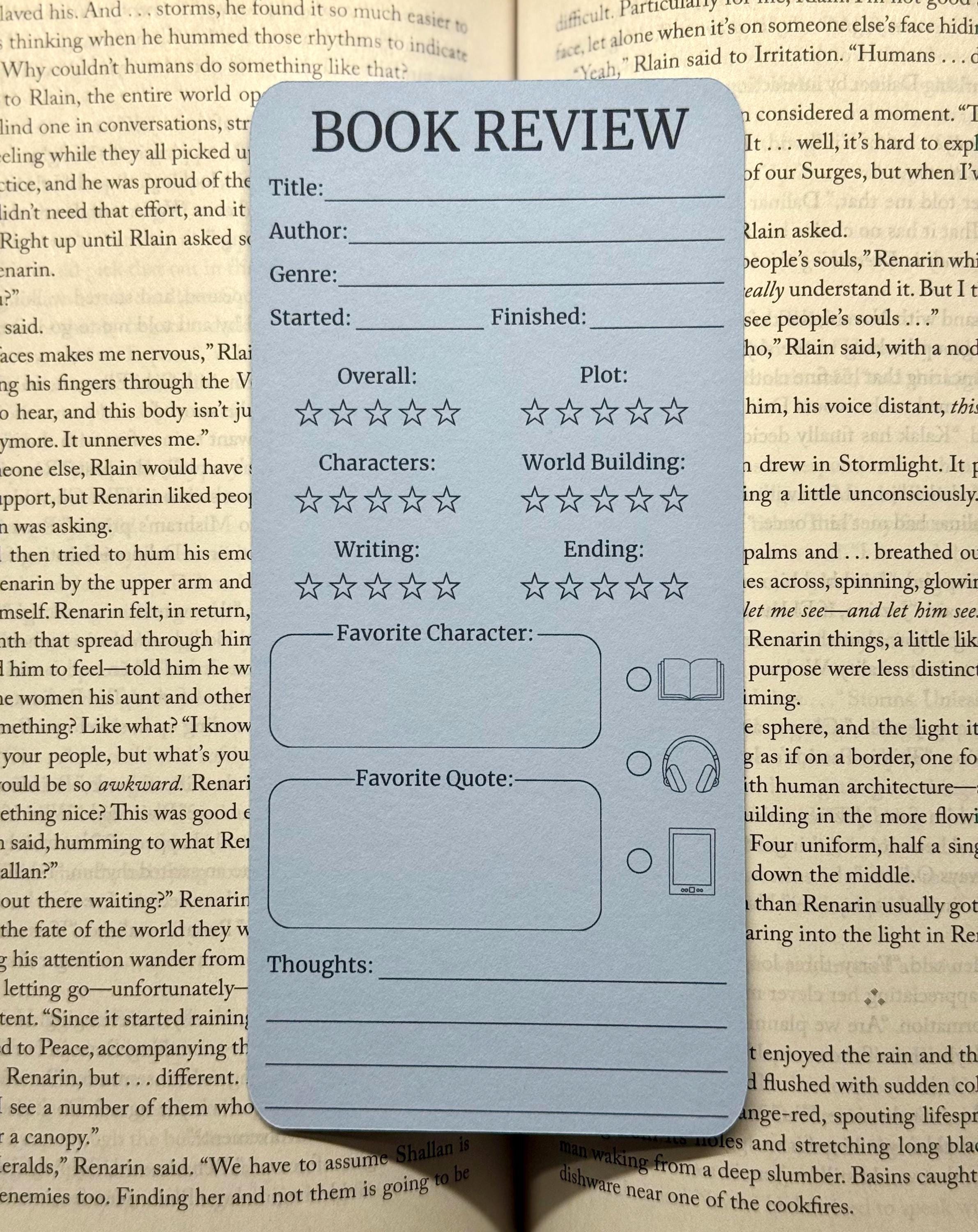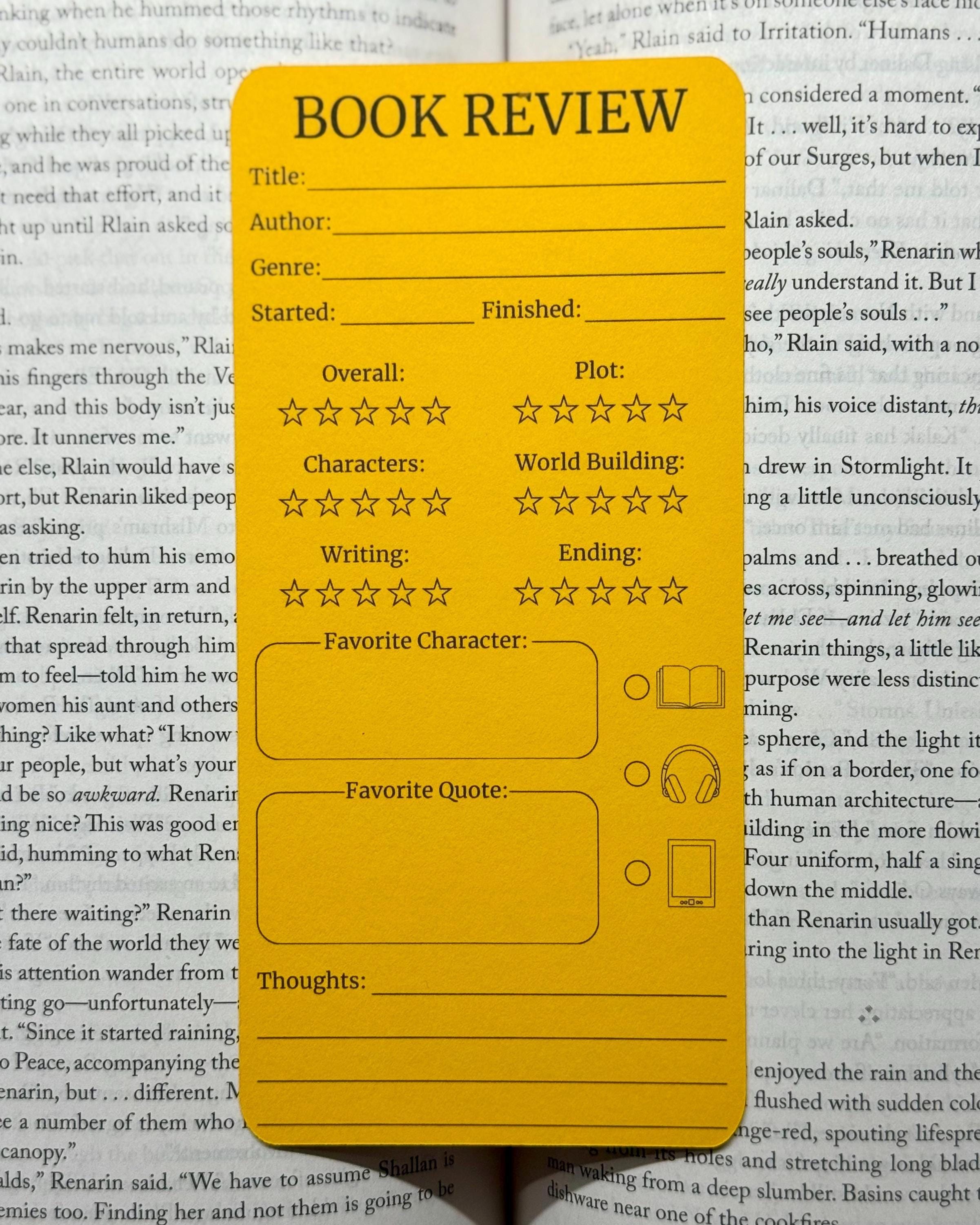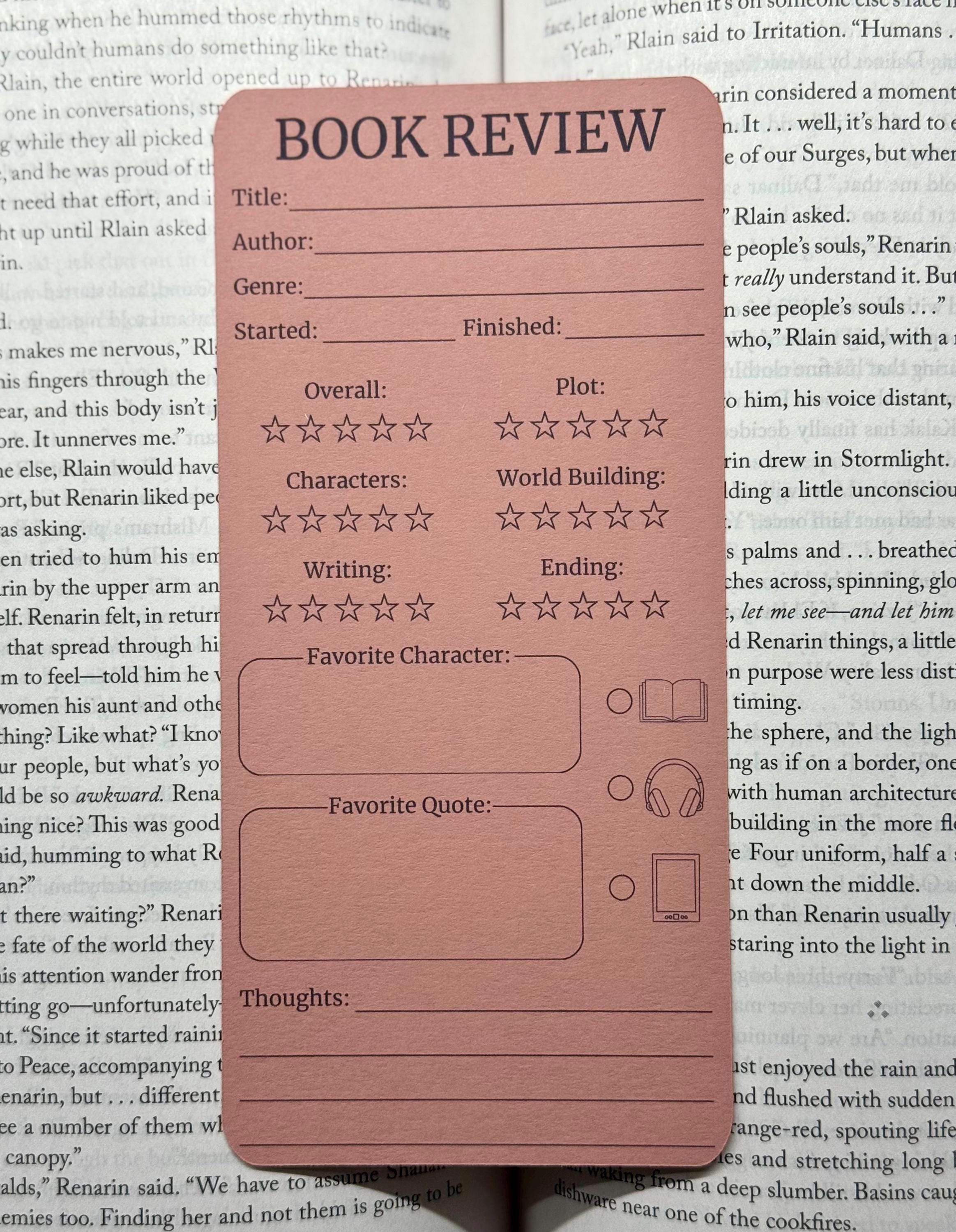 Each bookmark measures 3.25x7 inches, providing ample space to record your review of your favorite books. Write the book title, author, genre, start and end dates, favorite character, favorite quote, miscellaneous thoughts and give each a rating with the star system to reflect your thoughts.