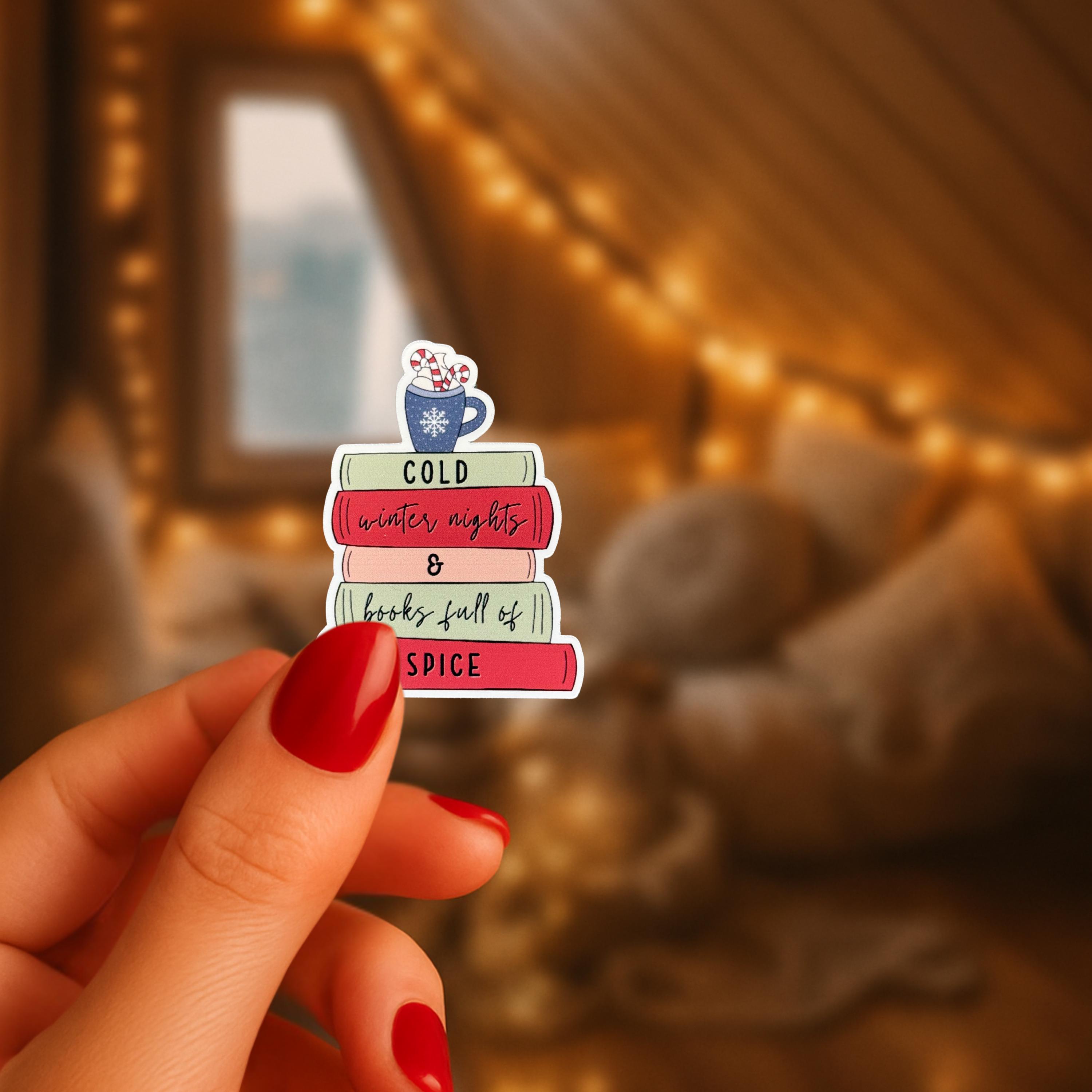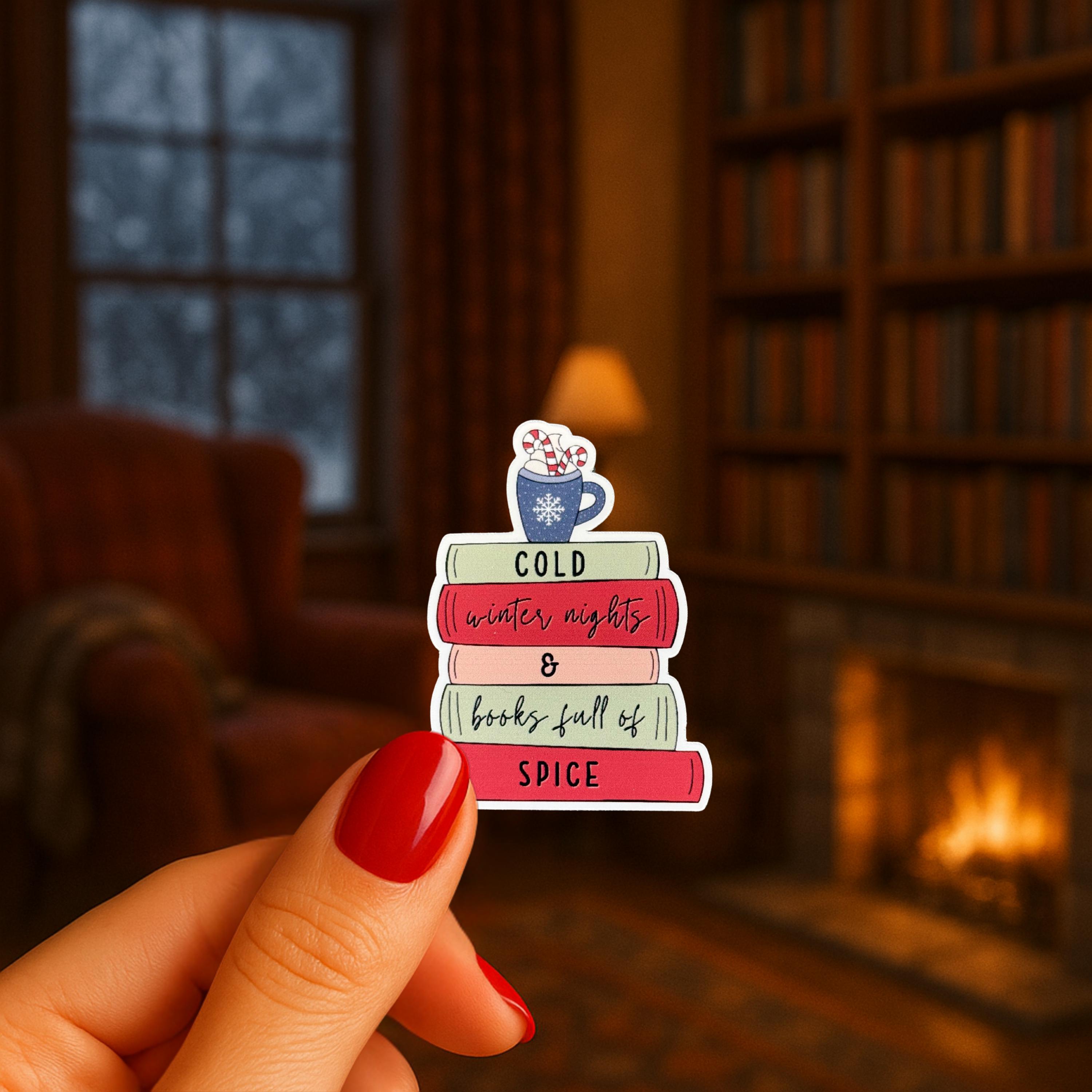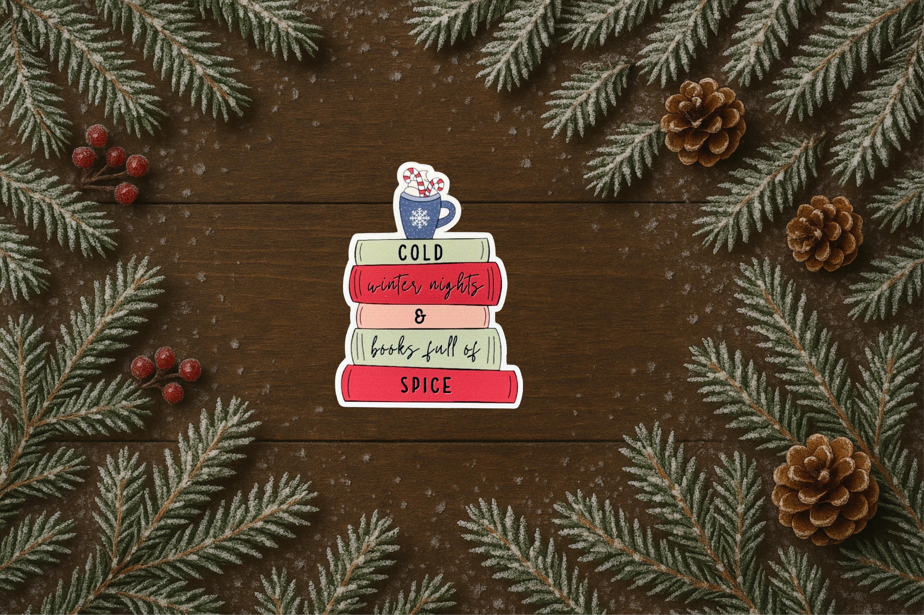 Add a touch of cozy holiday magic to your favorite belongings with this charming Bookish Christmas Sticker featuring a cold winter nights and books full of spice theme. Perfect for book lovers who cherish the warmth of a good read during the chilly season, this glossy vinyl decal combines festive cheer with literary love. Whether you're decorating your water bottle, laptop, Kindle, journal, or planner - it’s a delightful gift for Christmas, holidays, or any bookish winter night celebration.