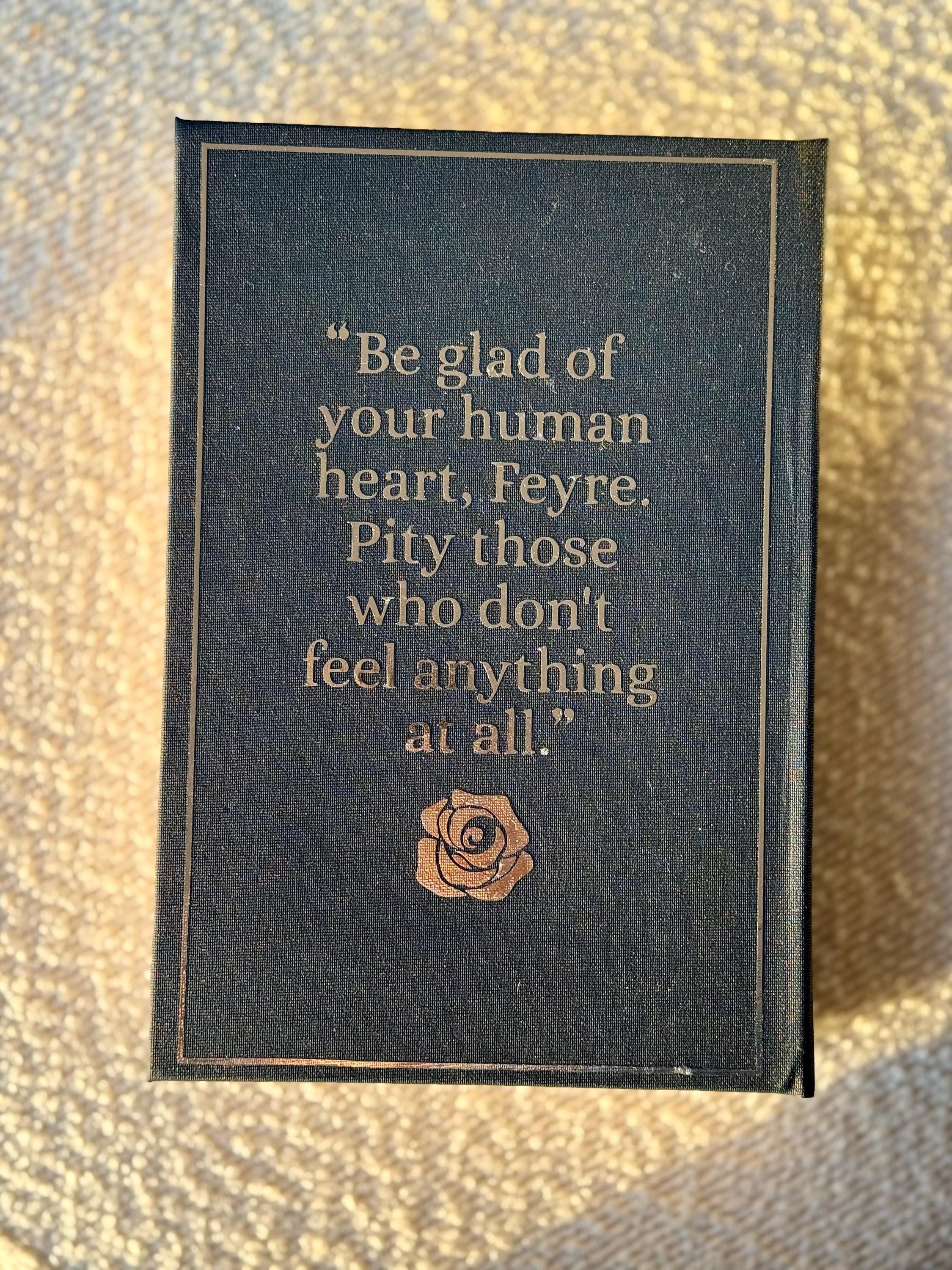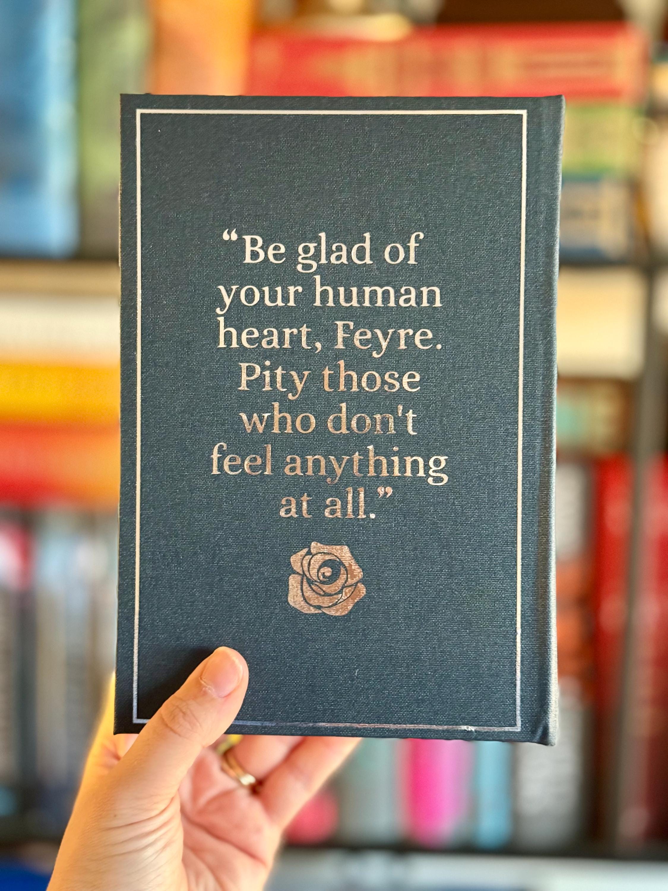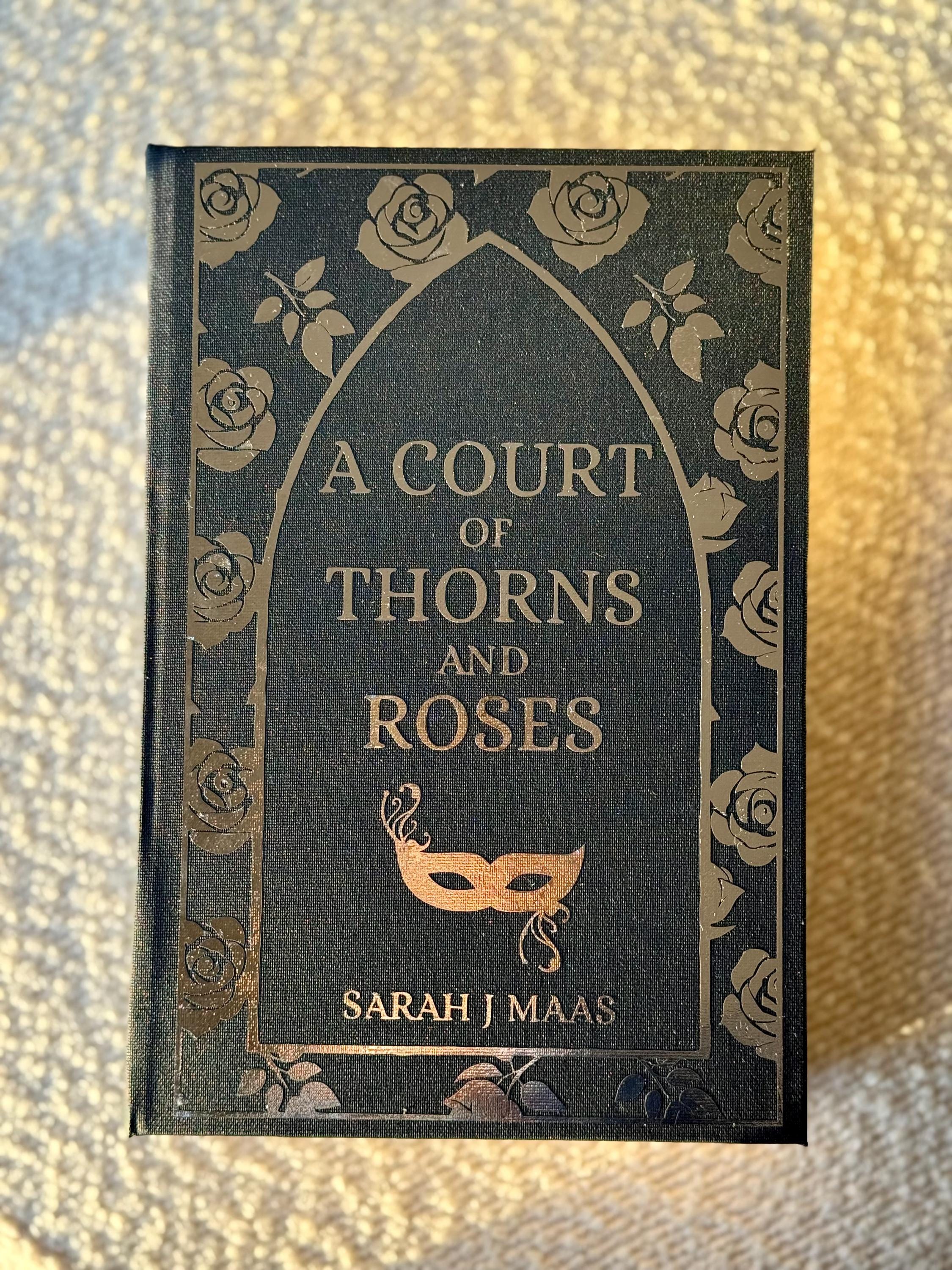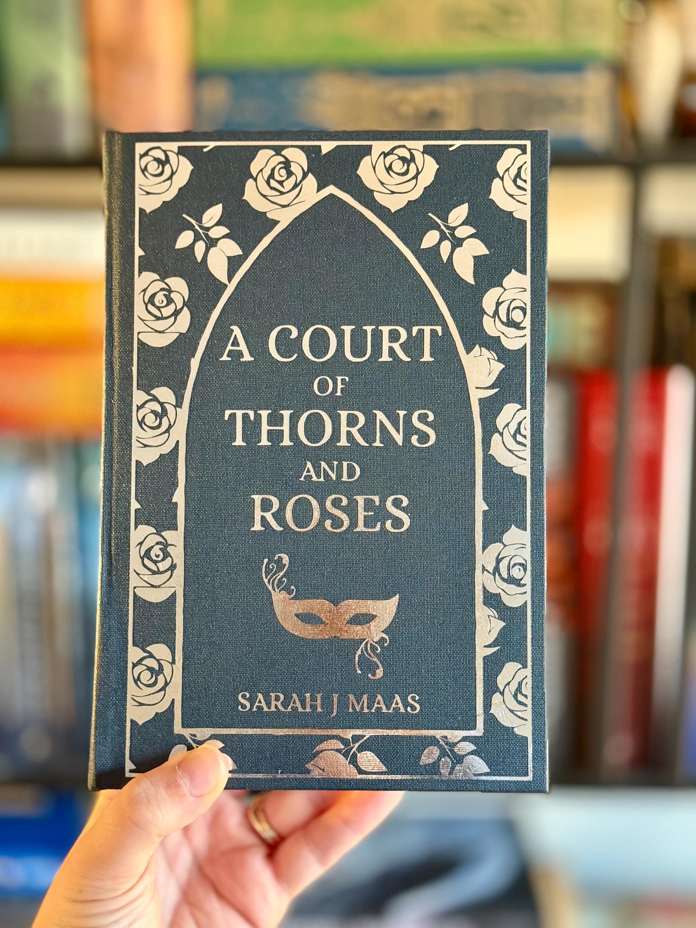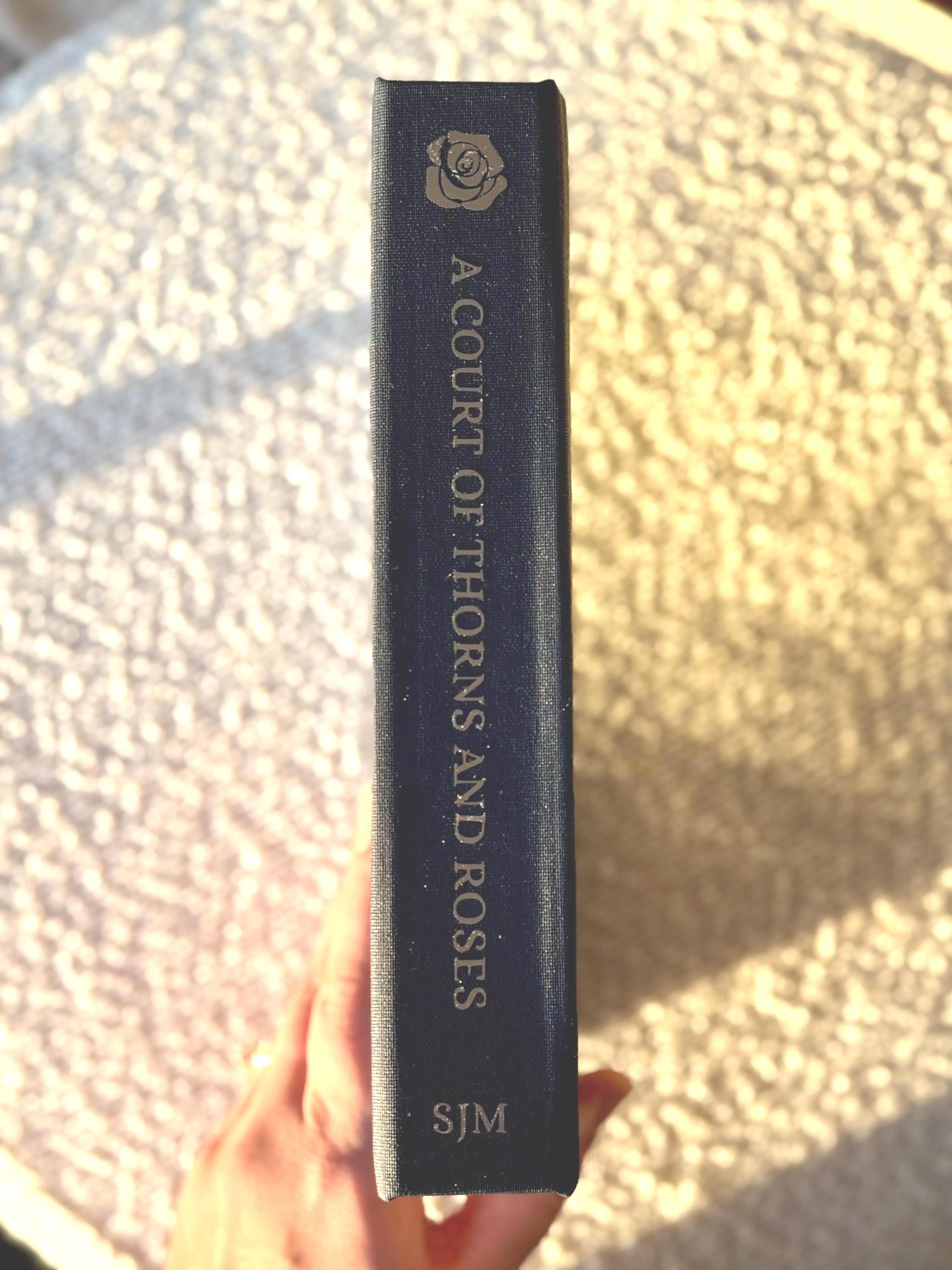This is a hand-bound, custom hardcover of the popular A Court of Thorns and Roses by Sarah J Maas. This book features a navy blue cover, silver metallic lettering and a night sky design inspired by the story.