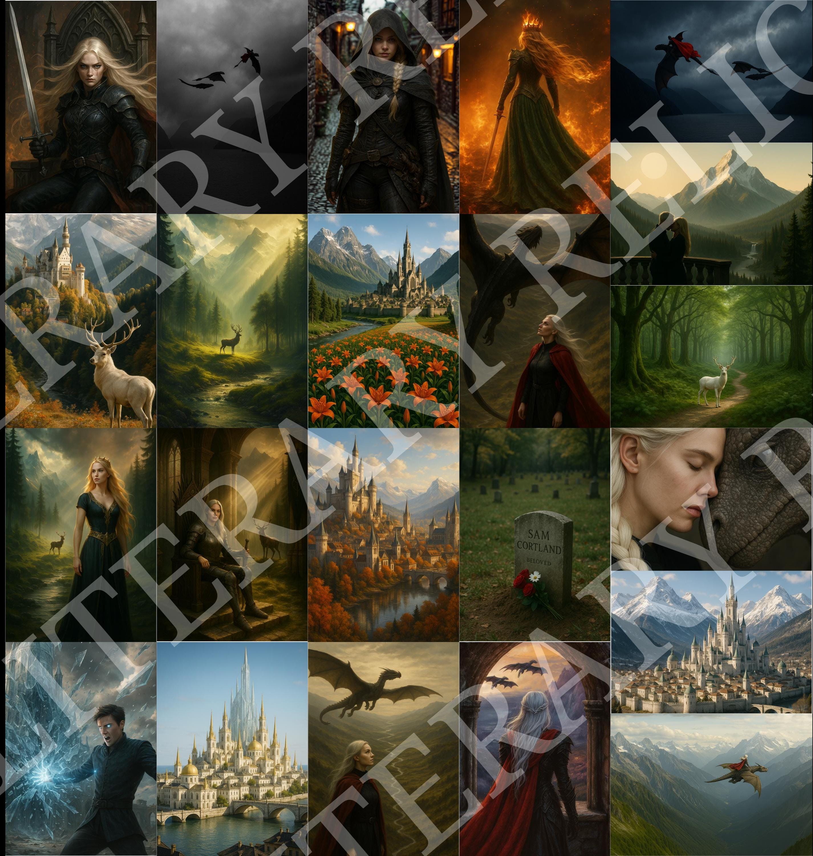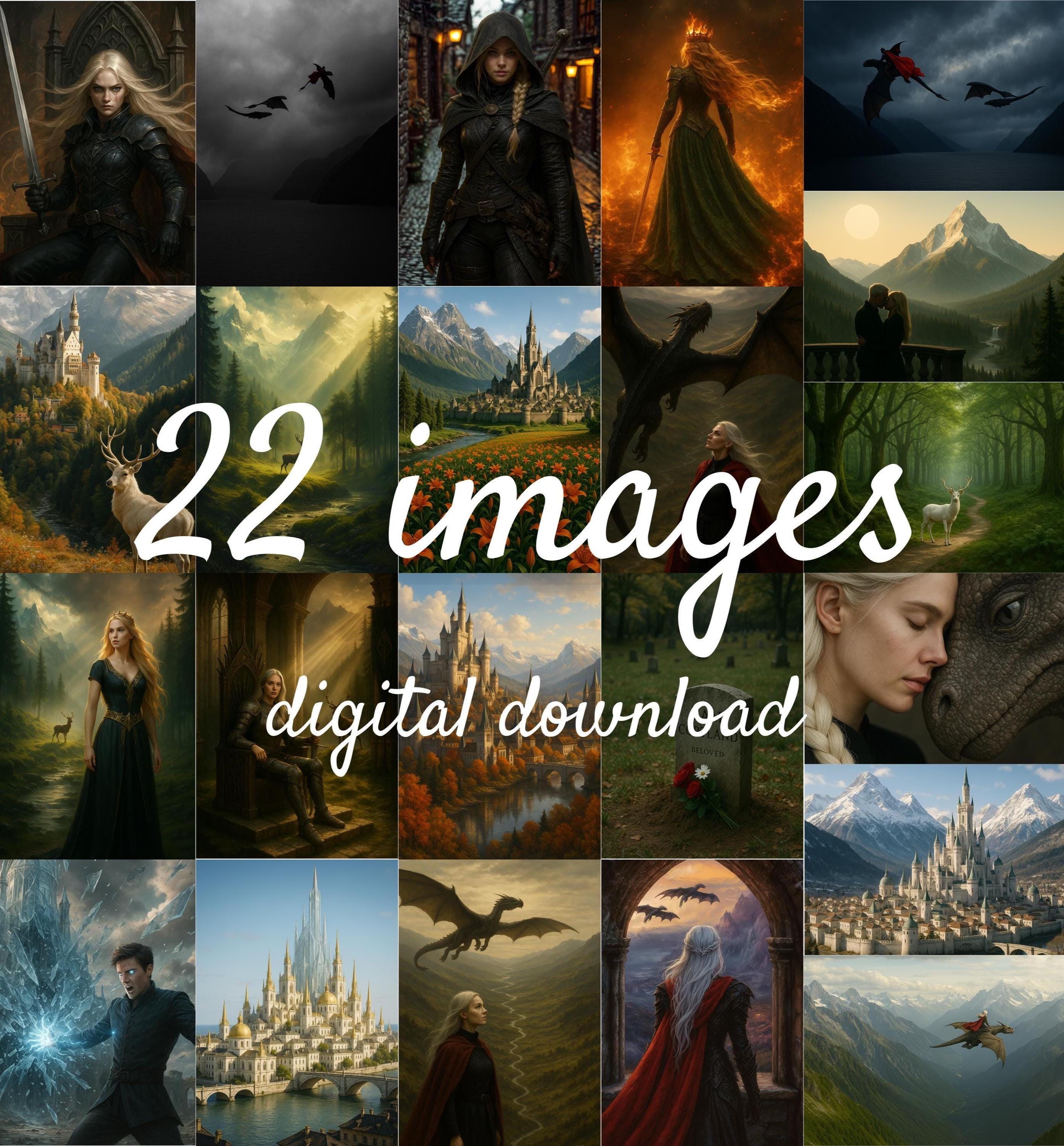 Key features: * 22 high-resolution digital images perfect for wall art, library decor, or social media inspiration * Beautifully themed around high fantasy themes including castles, dragons, heroines, night court, and strong female leads * Easy to download, print, and customize to fit your space and style